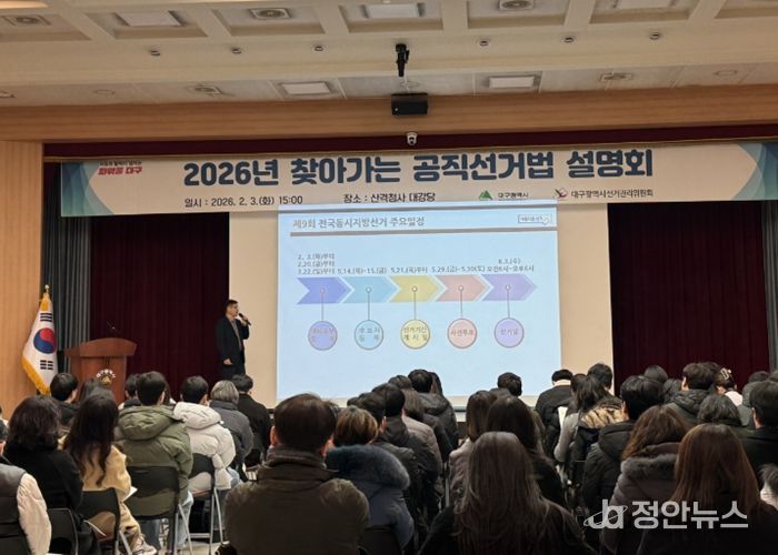 정안뉴스 안정주 기자 | 대구광역시는 6월 3일 실시되는 ‘제9회 전국동시지방선거’를 앞두고 공무원의 정치적 중립을 다짐하고 공직선거법 이해도를 높이기 위해, 2월 3일 시청 산격청사에서 ‘찾아가는 공직선거법 설명회’를 개최했다.