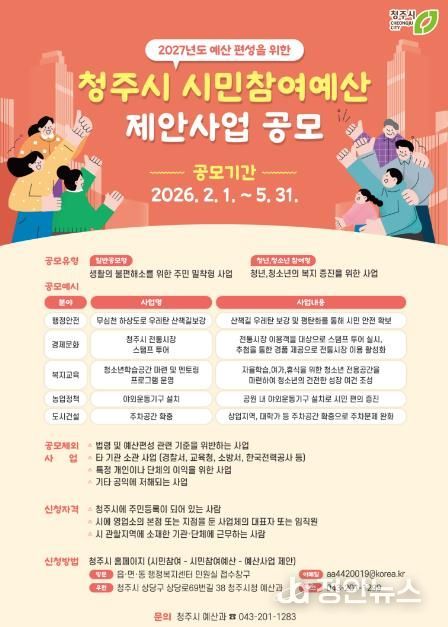 정안뉴스 황은경 기자 | 청주시는 2027년 예산편성을 위한 시민참여예산 제안사업 공모를 오는 5월 31일까지 접수한다고 4일 밝혔다.