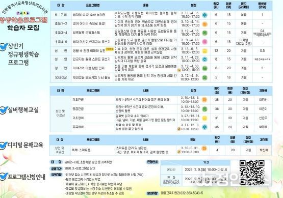 정안뉴스 안정주 기자 | 인천광역시교육청신트리도서관은 지역 주민의 생애주기별 학습 기회 제공을 위해 2026년 상반기 평생학습프로그램 학습자를 모집한다.