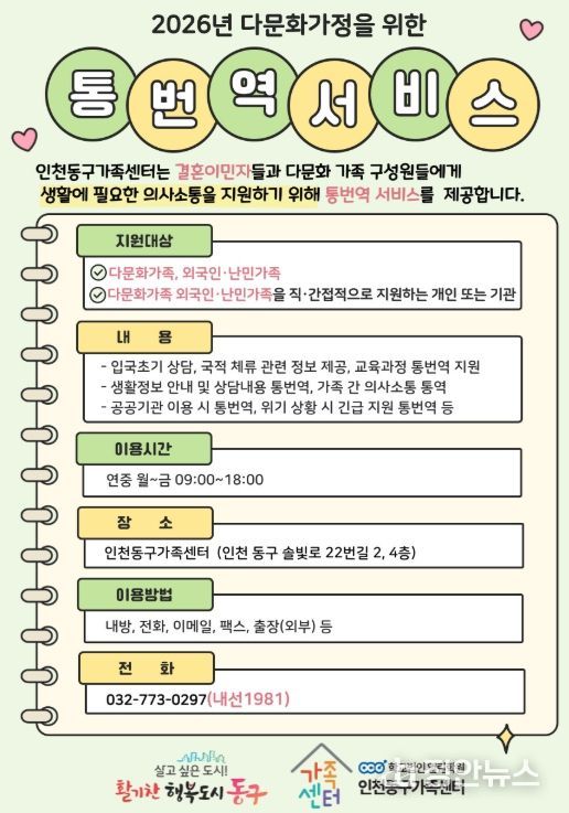 정안뉴스 안정주 기자 | 인천동구가족센터는 결혼이민자의 언어 장벽을 해소하고 안정적인 한국 사회 정착을 돕기 위해 ‘결혼이민자 통·번역 무료서비스’를 운영한다고 밝혔다.