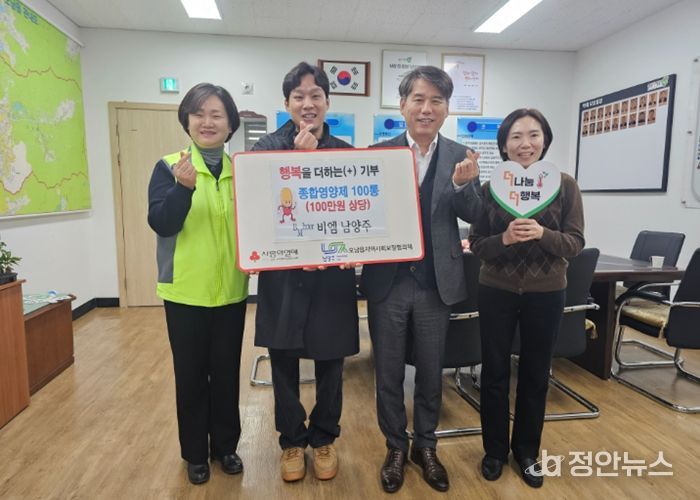 정안뉴스 안정주 기자 | 남양주시는 4일 유통 전문회사 비엠 남양주가 지역 내 취약계층을 위해 마련한 종합영양제 100통을 오남읍 지역사회보장협의체에 전달했다고 밝혔다.