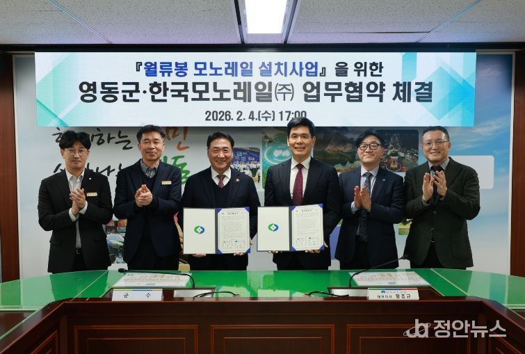 영동군은 4일 오후 군청 상황실에서 한국모노레일㈜과 월류봉 모노레일 설치를 위한 업무협약(MOU)을 체결하고, 민·관 협력을 바탕으로 관광 인프라를 확충해 체류형 관광 활성화에 나선다고 밝혔다.