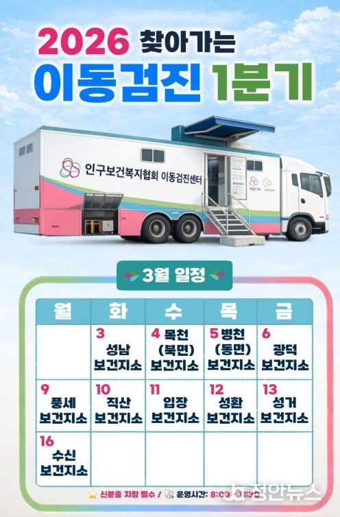 1분기 검진은 내달 3일 성남면을 시작으로 △4일 목천읍 △5일 병천면 △6일 광덕면 △9일 풍세면 △10일 직산읍 △11일 입장면 △12일 성환읍 △13일 성거읍 △16일 수신면 순으로 이어진다.