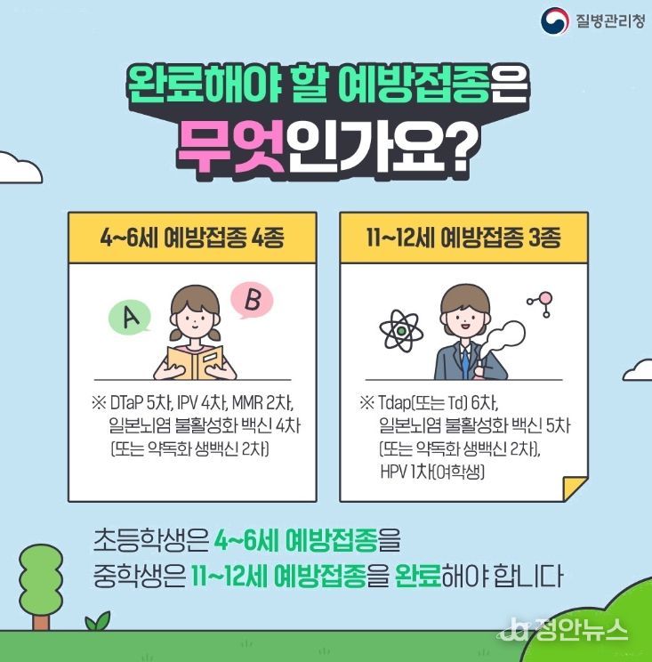 필수 예방접종 항목은 초등학생의 경우 △DTaP 5차 △IPV 4차 △MMR 2차 △일본뇌염 4차이며, 중학생의 경우 △Tdap 6차 △일본뇌염 5차 △HPV 1차다.