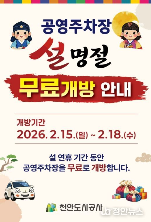 정안뉴스 황도연 기자 | 천안도시공사는 설 연휴기간 공영주차장을 무료로 개방한다고 5일 밝혔다.