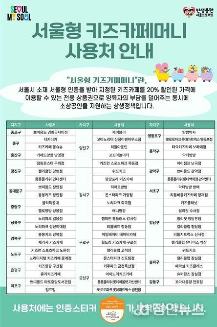 ‘서울형 키즈카페머니’는 서울형 인증기준을 통과한 민간 키즈카페에서 20% 할인된 가격에 이용할 수 있는 전용 상품권이다. 지난해에는 총 41억 원 규모로 발행, 조기 완판됐으며, 총 3만3천여 명에게 할인구매 혜택을 제공했다. 현재 ‘서울형 키즈카페머니’를 사용할 수 있는 키즈카페는 총 62개소다.