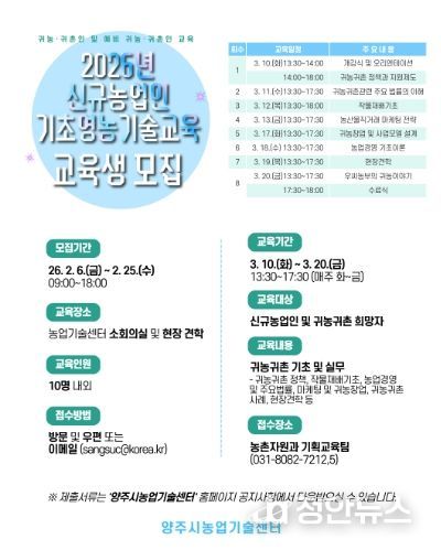 정안뉴스 안정주 기자 | 양주시는 농촌지역으로 이주한 귀농․귀촌인과 예비 귀농인의 안정적인 농촌 정착을 지원하기 위해 ‘2026년 신규농업인 기초영농기술교육’ 교육생을 모집한다.