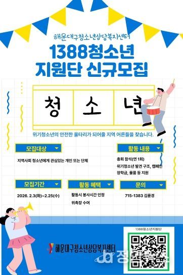 정안뉴스 황정혜 기자 | 해운대구 청소년상담복지센터는 지역 내 위기청소년들을 조기에 발견하고 든든한 울타리가 되어줄 ‘1388청소년지원단’을 이달 25일까지 공개 모집한다고 밝혔다.