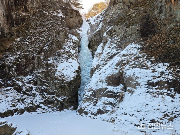 폭포에서 떨어진 물은 천모산 계곡을 따라 흐르며 고요한 산중 풍경을 이루고, 이어지는 오솔길은 겨울 산행의 운치를 더한다.