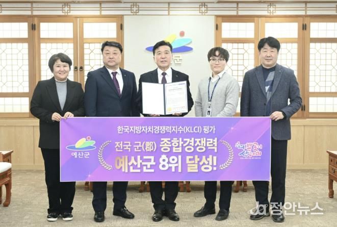 정안뉴스 황도연 기자 | 예산군은 (사)한국공공자치연구원이 발표한 ‘2025년 한국지방자치경쟁력지수(KLCI)’에서 군 단위 종합경쟁력 부문 508.1점을 기록하며 전국 82개 군 가운데 종합 8위를 차지했다고 밝혔다.