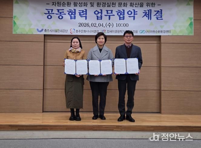 정안뉴스 황은경 기자 | 충주시시설관리공단은 지난 4일 충주문화시니어클럽, 업싸이클&자원순환 환경센터와 함께 자원순환 확대와 ESG 경영 실천을 위한 상호협력 협약을 체결했다고 밝혔다.