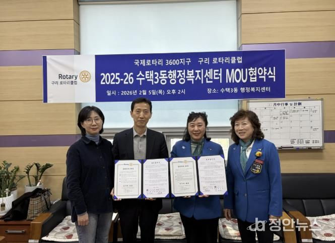 정안뉴스 안정주 기자 | 구리시 수택3동 행정복지센터는 지난 5일, 구리로타리클럽과 지역사회 취약계층의 복지 증진과 나눔 문화 확산을 위한 업무 협약을 체결했다고 밝혔다.