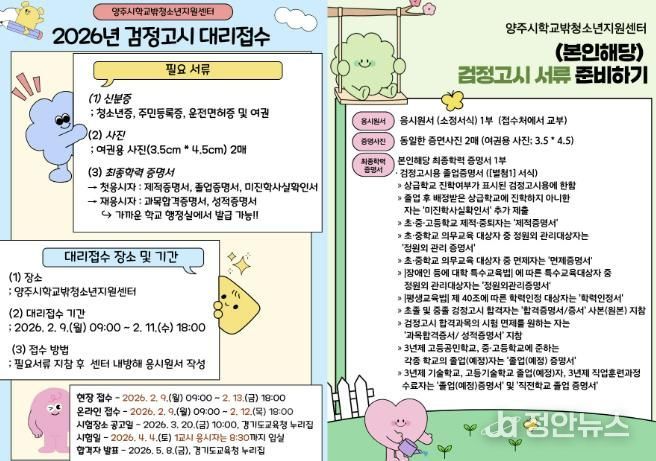 정안뉴스 안정주 기자 | 양주시학교밖청소년지원센터에서는 학교 밖 청소년들을 위해 2026년 제1회 초중고 졸업 학력 검정고시 응시 원서 접수 대행을 지원한다.
