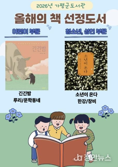 정안뉴스 안정주 기자 | 가평군도서관이 군민의 독서 문화 확산을 위해 ‘2026년 올해의 책’으로 루리 작가의 『긴긴밤』과 한강 작가의 『소년이 온다』를 선정했다.