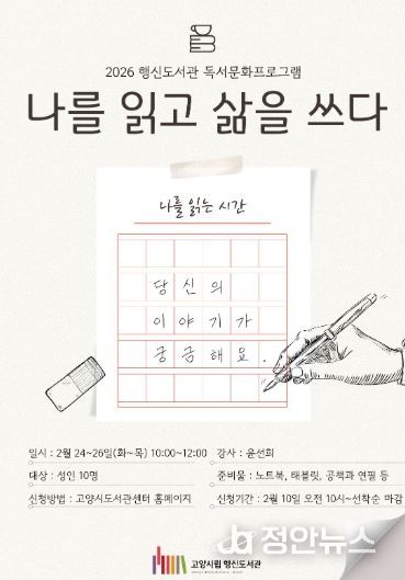 정안뉴스 안정주 기자 | 고양특례시 행신도서관은 일반 성인을 대상으로 하는 글쓰기 프로그램 ‘나를 읽고 삶을 쓰다’를 운영한다.