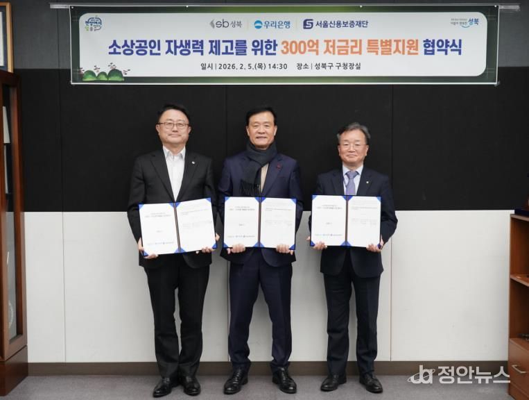정안뉴스 안정주 기자 | 서울 성북구가 지난 5일 우리은행, 서울신용보증재단과 함께 ‘소상공인 특별융자 지원 업무협약’을 체결했다.