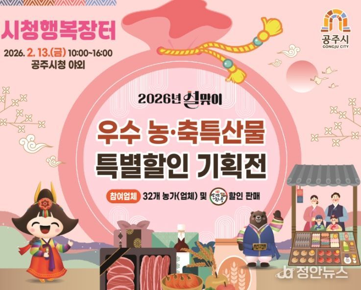 정안뉴스 황도연 기자 | 공주시는 다가오는 설 명절을 맞아 오는 2월 13일 오전 10시부터 오후 4시까지 공주시청 광장에서 설맞이 농특산물 직거래 ‘행복장터’를 운영한다고 밝혔다.