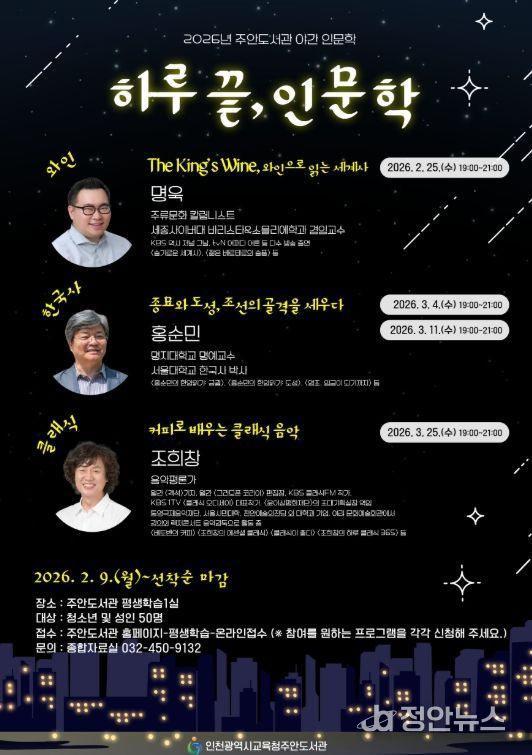 정안뉴스 안정주 기자 | 인천광역시교육청주안도서관은 2월부터 3월까지 시민들이 다양한 인문학 주제를 접할 수 있는 야간 인문학 프로그램 ‘하루 끝, 인문학’을 운영한다.