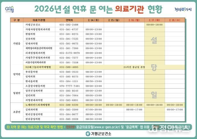 아울러 가평군은 설 연휴 동안 운영하는 의료기관, 약국 정보를 사전에 안내하고 있다. 연휴 기간 문을 여는 의료기관 및 약국 정보는 △가평군청 및 가평군보건소 홈페이지 △119구급상황관리센터 △응급의료포털 △보건복지콜센터에서 확인할 수 있다.