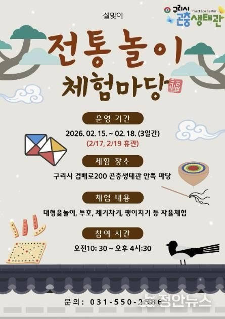 정안뉴스 안정주 기자 | 구리시는 민족 최대의 명절 설을 맞아 오는 2월 15일부터 18일까지 구리시 곤충생태관에서 ‘2026 설맞이 전통 놀이 체험 마당’을 운영한다고 밝혔다.