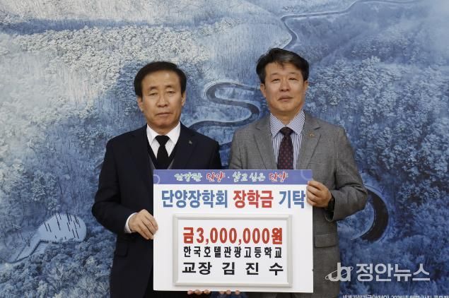 정안뉴스 황은경 기자 | 단양장학회는 지난 9일, 한국호텔관광고등학교 김진수 교장이 군수실에서 장학금 300만 원을 기탁했다고 밝혔다.