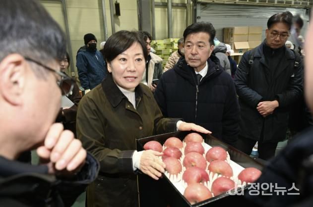 정안뉴스 황도연 기자 | 예산군은 송미령 농림축산식품부 장관이 지난 7일 예산농산물유통센터를 방문해 설 성수품인 사과의 저장 및 공급 상황을 점검했다고 밝혔다.