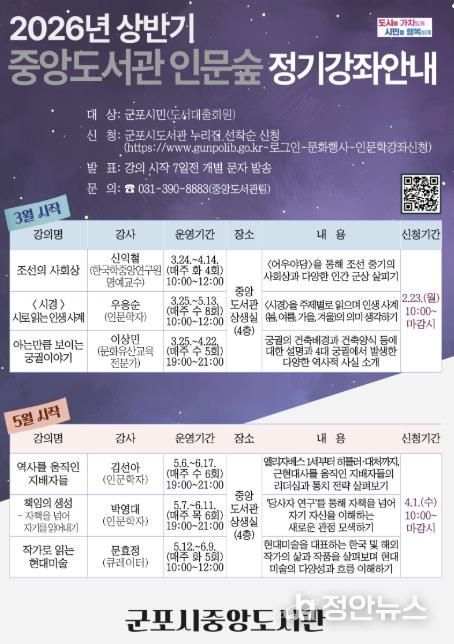 정안뉴스 안정주 기자 | 군포시중앙도서관은 시민의 인문학적 소양을 함양하고 공동체적 성찰의 기회를 확대하고자 ‘중앙도서관 인문숲’ 상반기 강좌를 운영한다.