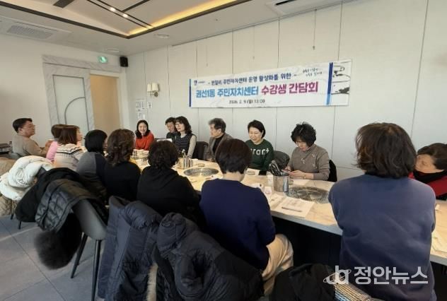 정안뉴스 안정주 기자 | 지난 6일 및 9일, 권선1동 주민자치회는 주민자치센터 프로그램 운영 활성화를 도모하고자 2026년 권선1동 주민자치센터 강사 간담회 및 수강생 간담회를 각각 개최했다.
