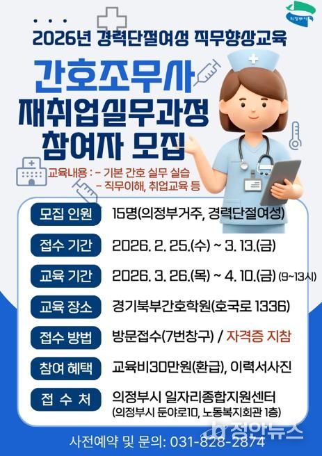 정안뉴스 안정주 기자 | 의정부시는 관내 경력단절여성 구직자를 위한 맞춤형 직업교육으로 ‘간호조무사 재취업 실무과정’ 참여자를 모집한다.