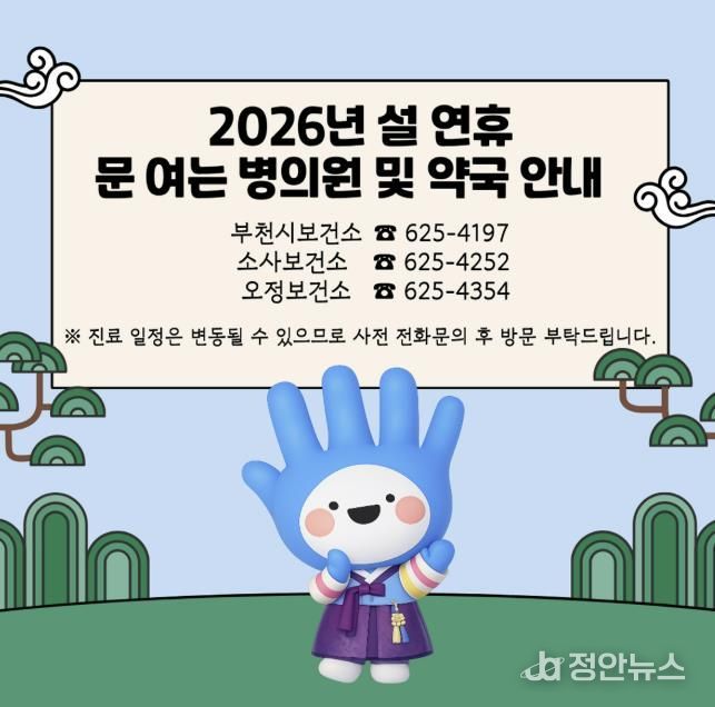 정안뉴스 안정주 기자 | 부천시는 설 연휴 기간인 2월 14일부터 18일까지 의료공백을 방지하고 시민 불편을 최소화하기 위해 관내 의료기관 및 약국과 협력해 비상진료체계를 운영하며, 연휴 중 발생할 수 있는 응급 상황에 신속히 대응하고자 부천시보건소 내 응급진료상황실도 함께 가동한다.