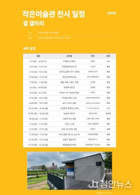 정안뉴스 안정주 기자 | 안성시는 2월 9일 ‘안성시 작은미술관(결갤러리, 시옷갤러리) 전시 공모’ 심사 결과를 발표하고, 총 31개의 전시를 최종 선정했다고 밝혔다.