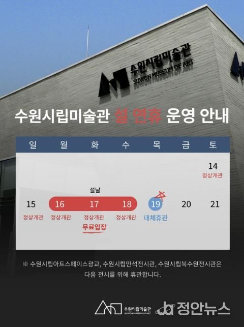 수원시립미술관 행궁 본관은 설 연휴 기간인 2월 15일부터 18일까지 정상 개방하며 설 당일인 2월 17일에는 무료 관람을 실시하며, 2월 19일에 대체 휴관한다.