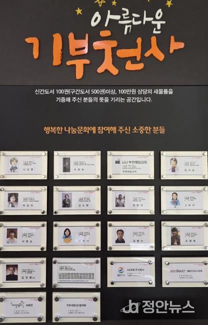 정안뉴스 안정주 기자 | 부천시는 기증자에 대한 감사의 뜻을 전하고 기부 문화를 확산하기 위해 상동도서관 1층 로비에 설치된 ‘아름다운 기부천사’ 게시판에 신규 기증기관 2곳인 ㈜웅진과 부천서점(업)협의회를 등재했다고 10일 밝혔다.