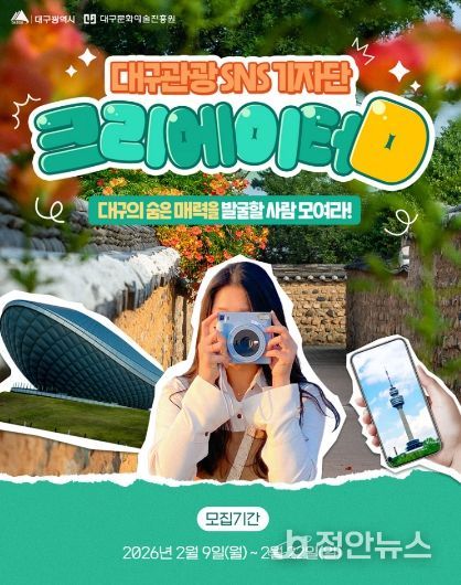 정안뉴스 안정주 기자 | 대구광역시와 대구문화예술진흥원은 대구 관광의 매력을 발굴하고, 확산할 대구관광 크리에이터D를 다가오는 22일까지 모집한다.