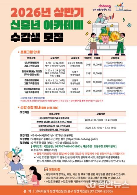 정안뉴스 안정주 기자 | 서울 도봉구가 2026년 상반기 신중년 아카데미 수강생을 모집한다. 이번 상반기는 신중년들이 제2의 인생을 준비할 수 있는 인생재설계 과정과 직업 역량 강화를 위한 강의로 구성된다.