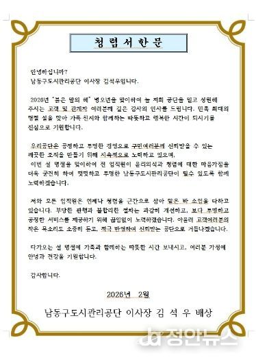 정안뉴스 안정주 기자 | 인천시 남동구 도시관리공단은 청렴 문화 정착을 위해 공사, 용역, 물품 관련 업체와 전 직원에게 ‘청렴 서한문’을 발송했다고 11일 전했다.