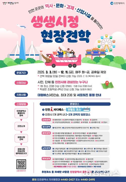 정안뉴스 안정주 기자 | 인천광역시가 인천의 주요 사업 현장과 문화·환경 시설을 직접 방문하는 ‘2026년 생생시정 현장견학’을 오는 3월 3일부터 본격 시작한다.