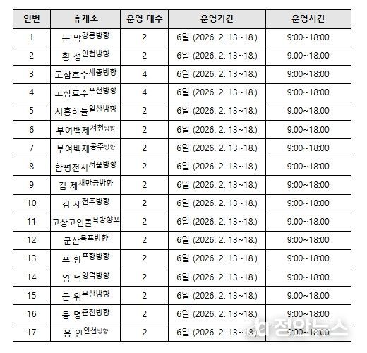 아울러 연휴 기간 중 이용자 불편을 최소화하기 위해 전화상담 창구(☏ 1661-9408) 등 비상연락체계가 운영된다.