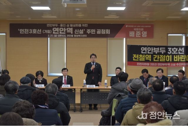 배준영 국회의원은 지난해 2월 ‘인천 3호선 연안역 신설 주민공청회’를 주최해, 연안부두 인근 주민의 의견을 인천시와 국토교통부에 전달하는 등 도시철도망이 인천 곳곳까지 이어질 수 있도록 최선을 다 해왔다.