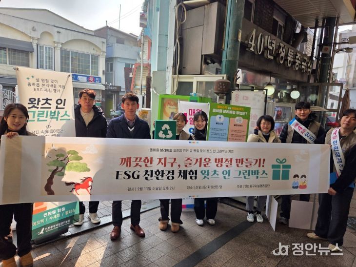 정안뉴스 안정주 기자 | 인천중구시설관리공단은 공단 임직원들이 설을 앞두고 지난 11일 신포국제시장에서 지역 주민들을 대상으로 생활 속 올바른 분리배출 실천을 유도하기 위한 체험형 친환경 행사 ‘왓츠 인 그린박스’를 진행했다고 밝혔다.