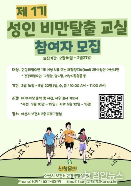 정안뉴스 황도연 기자 | 아산시 보건소는 2월 16일부터 2월 27일까지 성인을 대상으로 비만 예방과 건강 증진을 위한 ‘성인비만탈출교실’ 참여자를 모집한다.