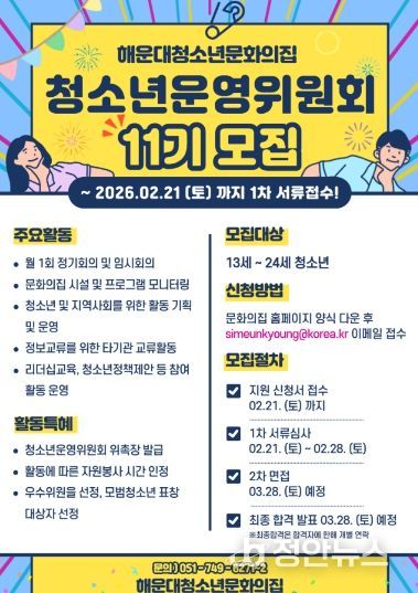 정안뉴스 황정혜 기자 | 해운대청소년문화의집이 지역 청소년의 참여 확대를 위해 ‘청소년운영위원회 11기 청바라기’를 공개 모집한다. 모집 대상은 해운대구에 거주하거나 관내 학교에 재학 중인 13세부터 24세 이하 청소년이며, 접수는 이달 21일까지 진행된다.
