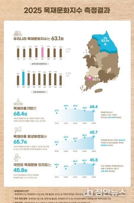 정안뉴스 안정주 기자 | 산림청은 전국 17개 광역시·도를 대상으로 목재문화 정착 및 진흥 수준을 평가한 ‘2025년 목재문화지수’ 결과를 30일 발표했다. 이 지수는 지역별 목재이용기반구축, 활성화, 목재문화 인지도 세 지표를 종합 평가한다.