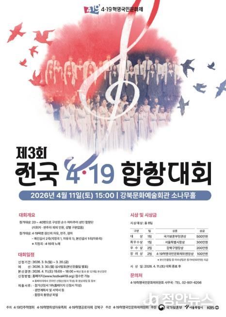 정안뉴스 안정주 기자 | 서울 강북구가 오는 4월 11일 오후 3시 강북문화예술회관 소나무홀에서 '제3회 전국 4·19 합창대회'를 개최한다.