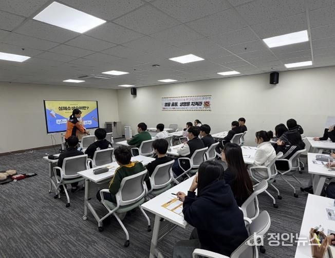 정안뉴스 안정주 기자 | 포천시청소년재단 포천시청소년교육문화센터 청소년방과후아카데미는 지난 23일 포천소방서와 연계해 참여 청소년 40명을 대상으로 ‘영웅 출동, 생명을 지켜라’심폐소생술(CPR) 교육을 실시했다.