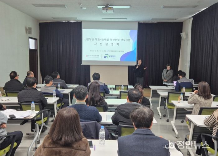 정안뉴스 안정주 기자 | 경기도수원교육지원청은 신분당선 광교–호매실 복선전철 공사 추진에 앞서 2월 25일 국가철도공단과 함께 공사 구간 100m 이내에 위치한 5개 인접학교를 대상으로 사전설명회를 실시했다고 밝혔다.