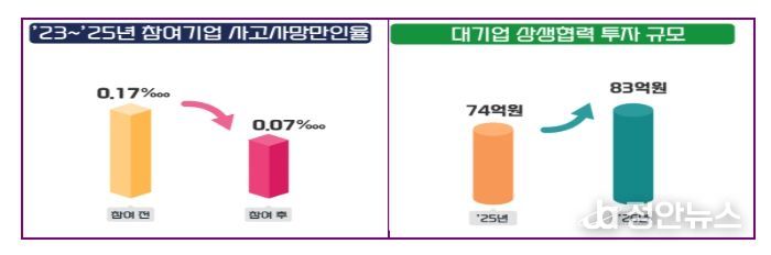 대기업과 정부의 지원을 받은 사업장은 안전한 일터로 거듭나고 있다. 지난 3년간 사업에 참여한 기업 10,453곳의 평균 사고사망만인율은 0.07‱로 참여 이전(0.17‱)보다 절반 이하로 감소했다.