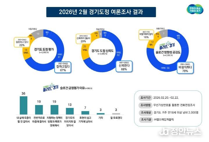 경기도가 ㈜엠브레인퍼블릭에 의뢰해 2월 20일부터 22일까지 실시한 정기 여론조사 결과, 경기도정에 대해 “잘하고 있다”는 응답은 67%, “잘못하고 있다”는 23%, “모름·무응답”은 10%였다.
