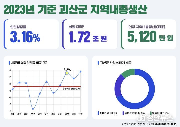 충북도가 최근 공표한 2023년 기준 ‘충청북도 시·군 단위 지역내총생산(GRDP)’ 추계결과에 따르면 괴산군의 실질성장률은 3.2%로 단양군(3.6%)에 도내 두 번째로 높았다.