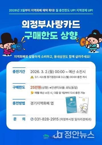 정안뉴스 안정주 기자 | 의정부시는 지역경제 활성화와 민생 안정을 위해 3월부터 의정부사랑카드(지역화폐) 월 구매 한도를 기존 15만 원에서 25만 원으로 상향한다.